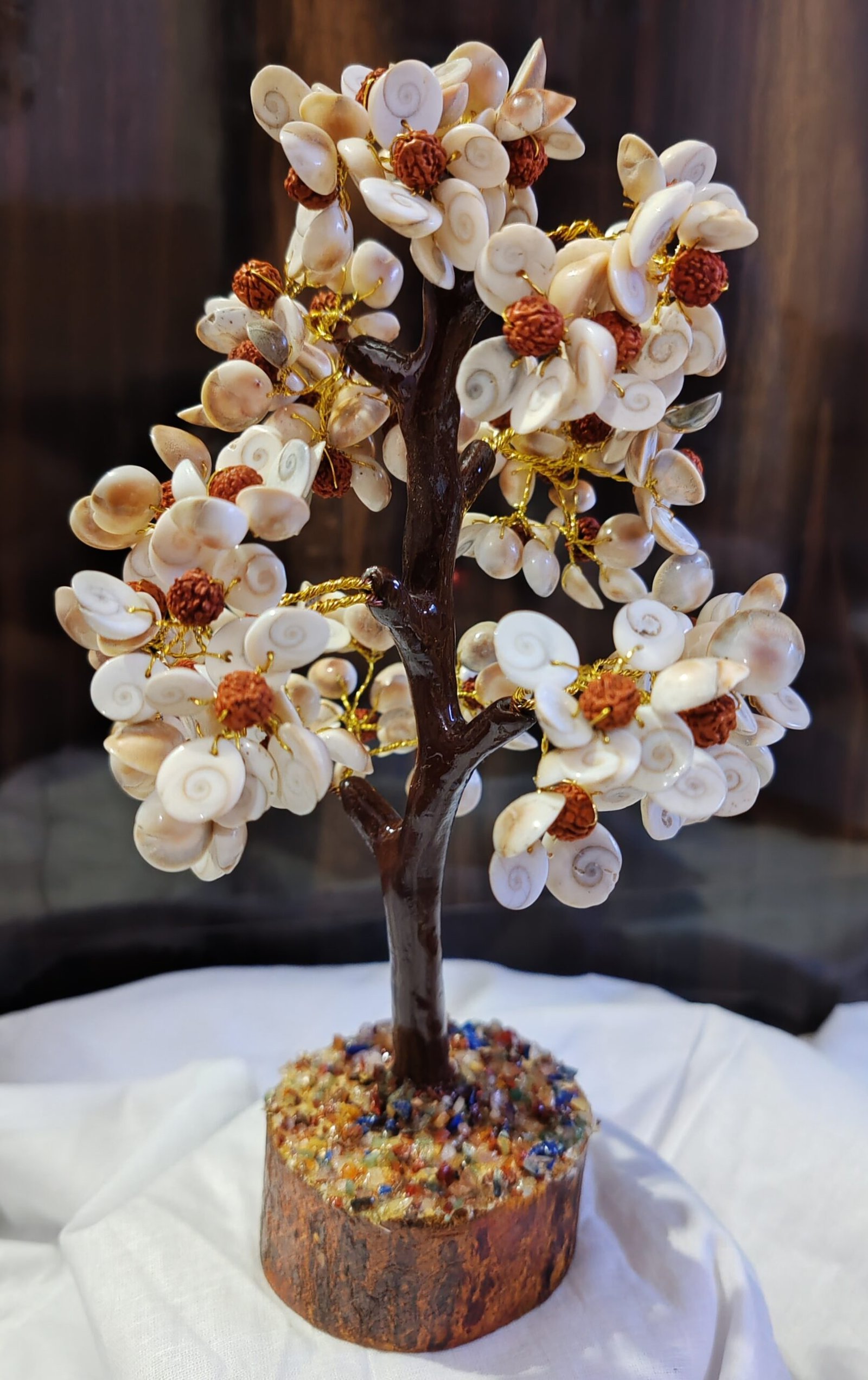 The Gomti Chakra with Rudraksha Tree, featuring 300 beads, is a sacred combination revered for its spiritual significance and mystical properties. Gomti Chakra, believed to be a rare and auspicious natural shell found in the Gomti River, is associated with Lord Vishnu and Goddess Lakshmi, symbolizing prosperity, abundance, and protection. Rudraksha beads, known for their divine connection and protective energies, are intricately woven into the tree, enhancing its potency.